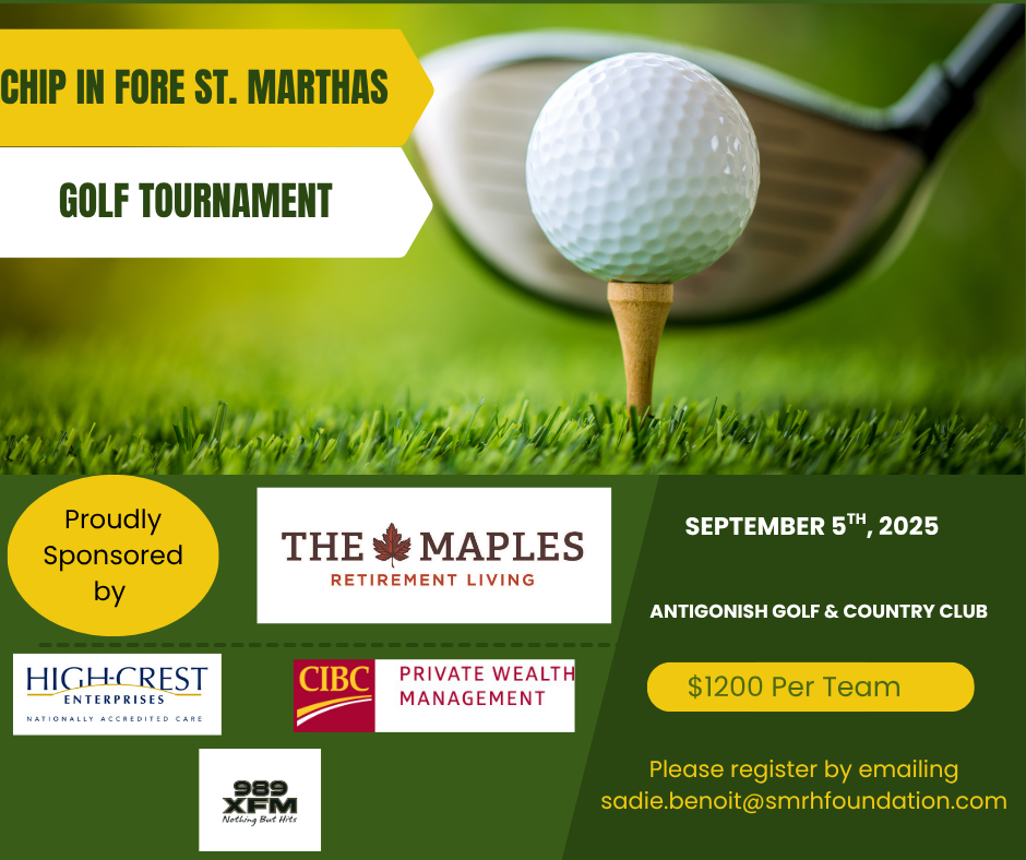 Here you will find information on our Annual Chip in Fore St. Martha’s Annual Golf Tournament proudly presented by The Maples Retirement Living to be held at the beautiful Antigonish Golf and Country Club on Friday, September 5, 2025.